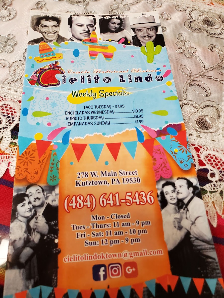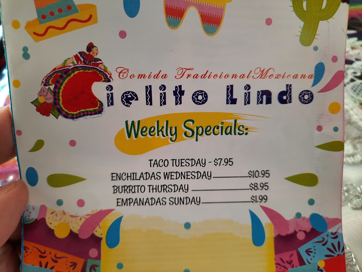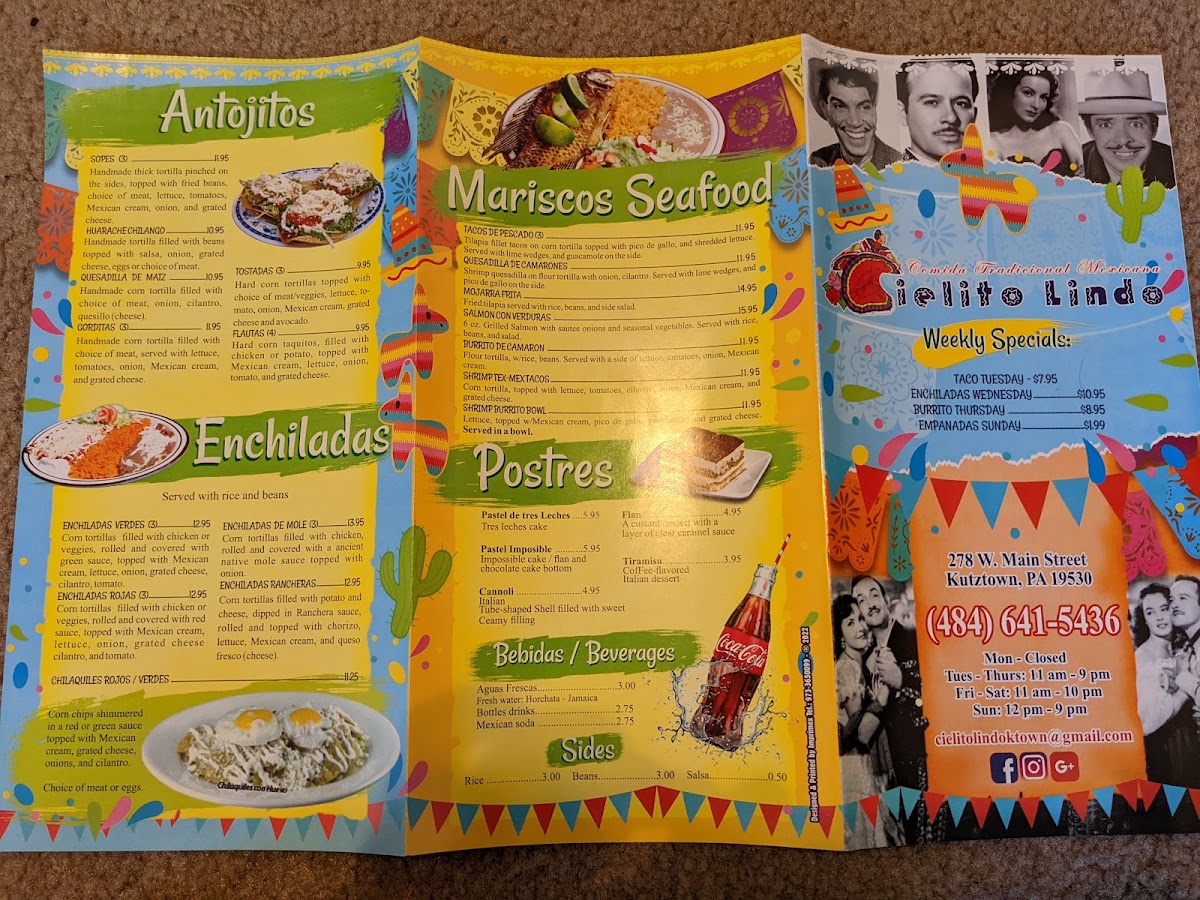 From a reviewer’s perspective, the menu at Cielito Lindo Mexican Restaurant feels like a well-rounded celebration of classic and comforting Mexican flavors, thoughtfully organized to satisfy a wide range of tastes. The Fajitas section stands out with hearty options like Chicken, Veggie, Combinadas, Steak And Chicken, Steak, and Shrimp, offering that sizzling, shareable experience many diners look for. Seafood lovers are equally well cared for with dishes such as Quesadilla De Camarones, Tacos De Pescado (3), Mojarra Frita, Salmón Con Verduras, and Shrimp Tex-Mex Tacos, which add freshness and variety to the menu. For those craving traditional street-style comfort, categories like Antojitos-including Flautas (4), Gorditas (3), Huarache Chilango, Quesadillas De Maiz, and Sopes (3)-and Tortas such as Pambazo, Torta De Milaneza, Torta De Lengua, Torta De Chorizo, and Torta De Bistec deliver bold, familiar flavors. The Enchiladas lineup, featuring Enchiladas De Mole (3), Enchiladas Verdes (3), Enchiladas Rancheras, Chilaquiles Rojos O Verdes, and Enchiladas Rojas (3), highlights the kitchen’s range of sauces and traditional preparations. Lighter choices are available too, with Salads like Taco Salad, Nopal Cielito Lindo, Grilled Chicken Salad, and Tossed Salad, while families will appreciate the straightforward Kids Menu options such as Chicken Fingers And Fries, Grilled Cheese And Fries, Cheese Quesadilla And Fries, and Cheeseburger And Fries. Rounding out the experience are satisfying Appetizers like Queso Dip, Papas Locas, Elotes Preparados, Chicharrones Preparados, and Nachos, refreshing Beverages including Jumex Juice, Jarritos, Aguas Frescas, Bottle Drinks, and Bottled Water, indulgent Postres like Flan, Churro, Cannoli, Tiramisu, and Pastel Imposible, plus classic Sides such as Rice And Beans, Rice, Beans, French Fries, and Extra Salsa-all combining to make the menu feel complete, satisfying, and true to its Mexican roots.